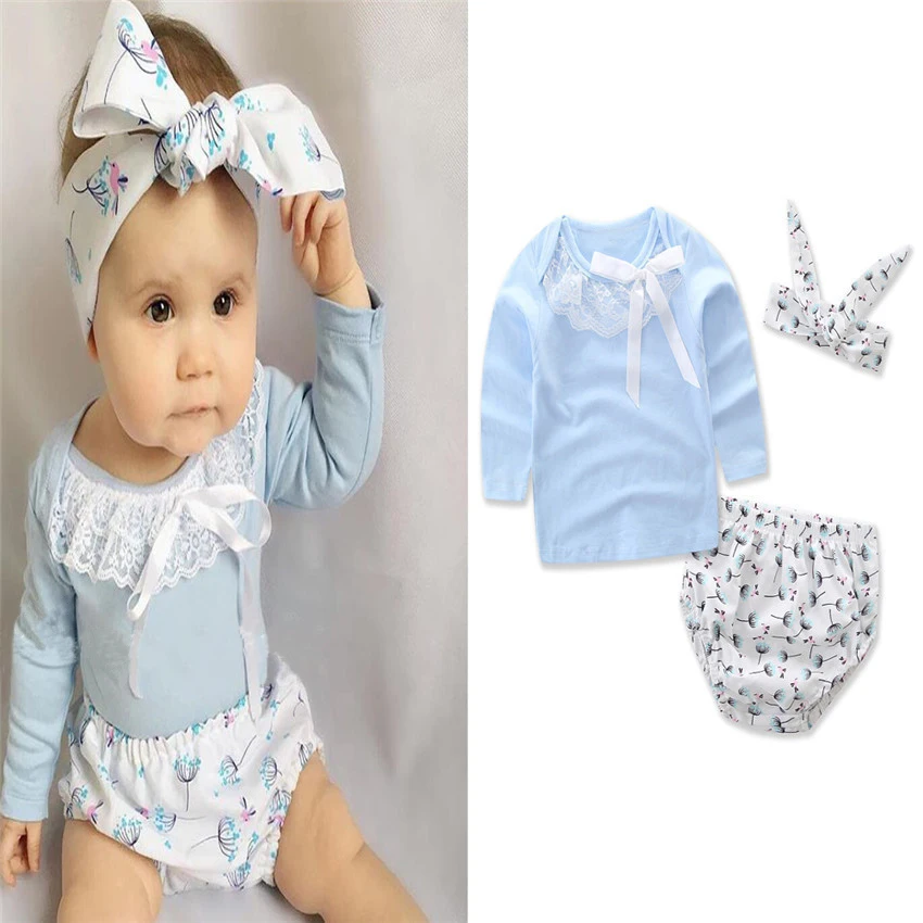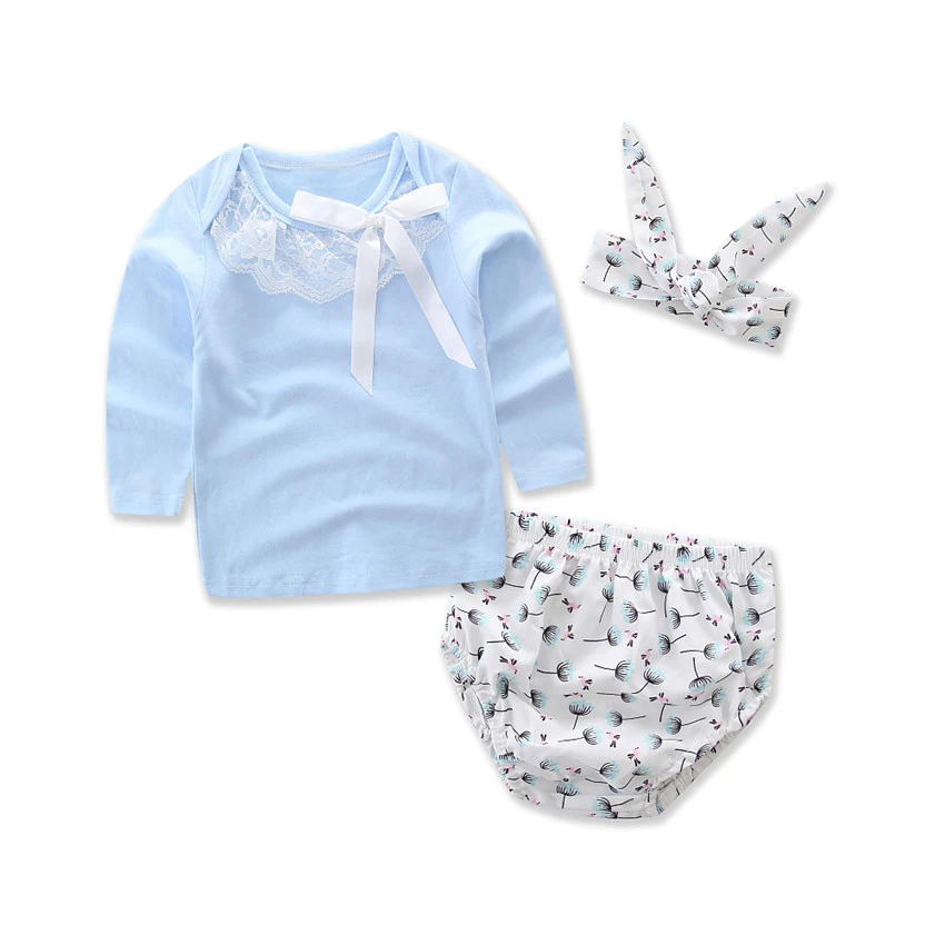 2017 Baby Girl clothing Set long sleeve lace Bow T-shirt+Shorts+headband 3pcs Infant bebe girl clot
