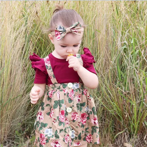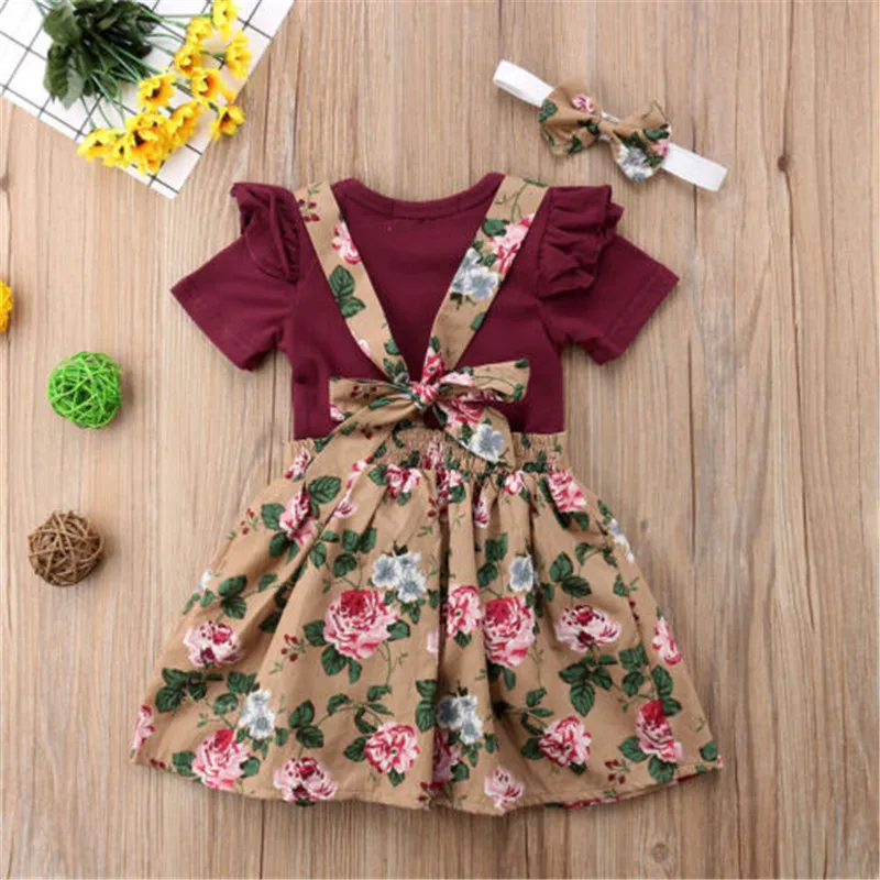 BEST QUALITY Newborn Baby Girl Clothes Set Short Sleeve Round Neck Bodysuit Floral Belt Skirt Headband Summer Gi