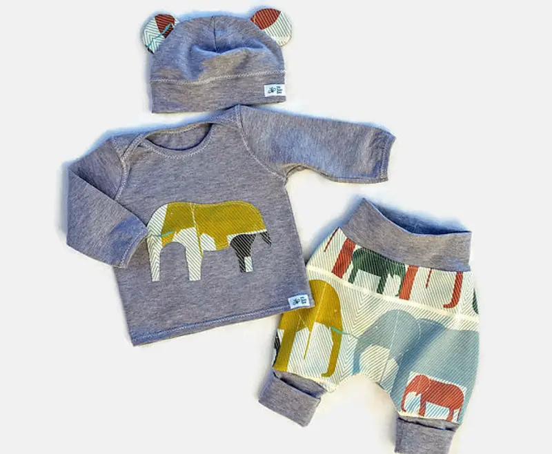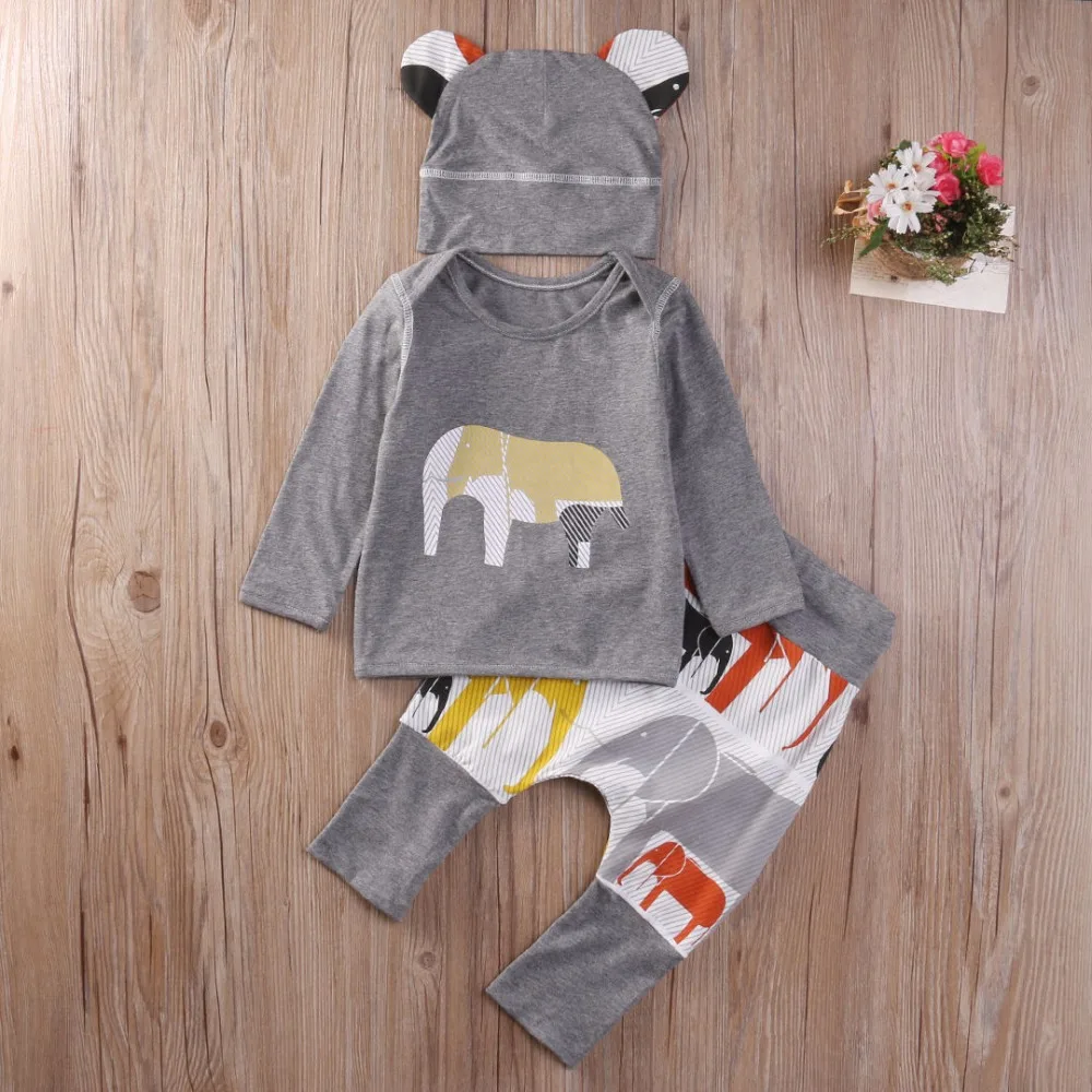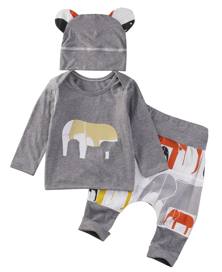 Infant Baby Clothing Sets Cute Hat Elephant Print Tops Grey T-shirt Panelled Pants 3pcs Bebe Kids C
