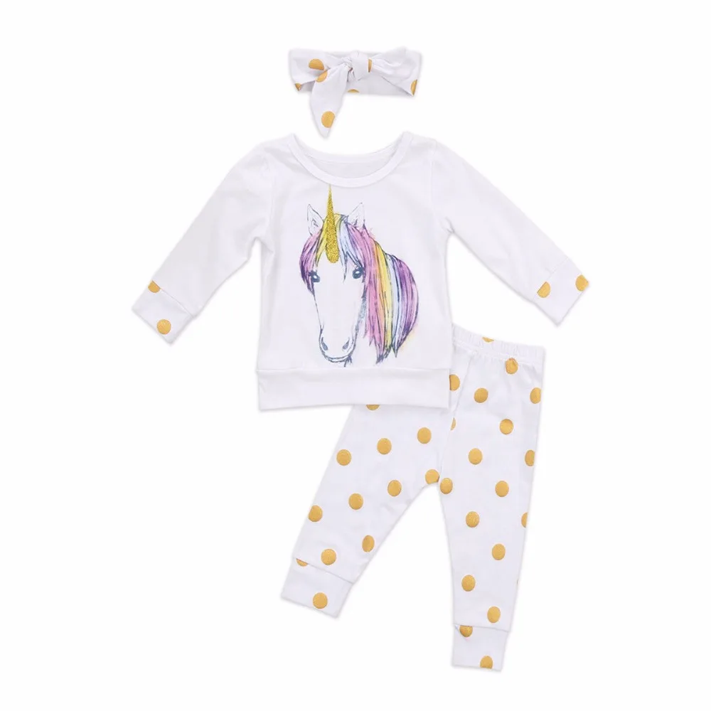 Cute Infant Baby Boys Clothes Suit Cartoon Unicon Print Rainbow Tops Dot Pants Headband 3stk Bebe G